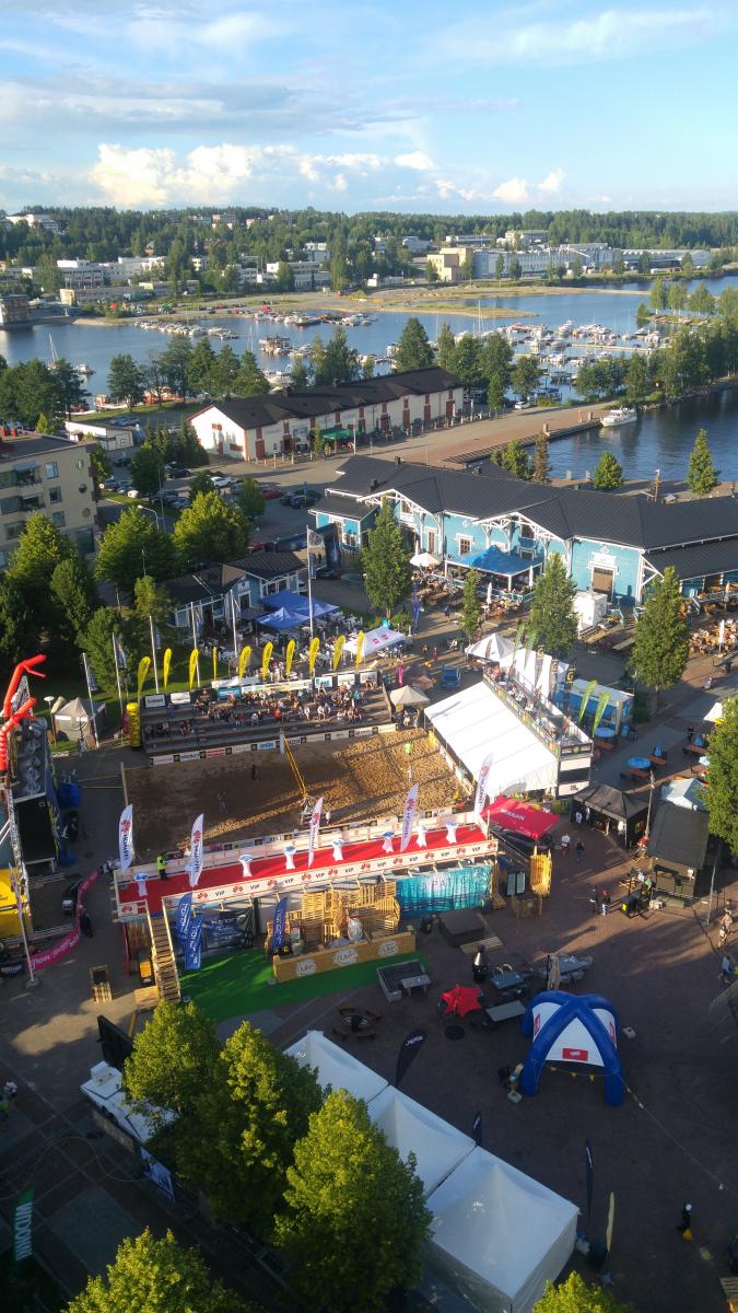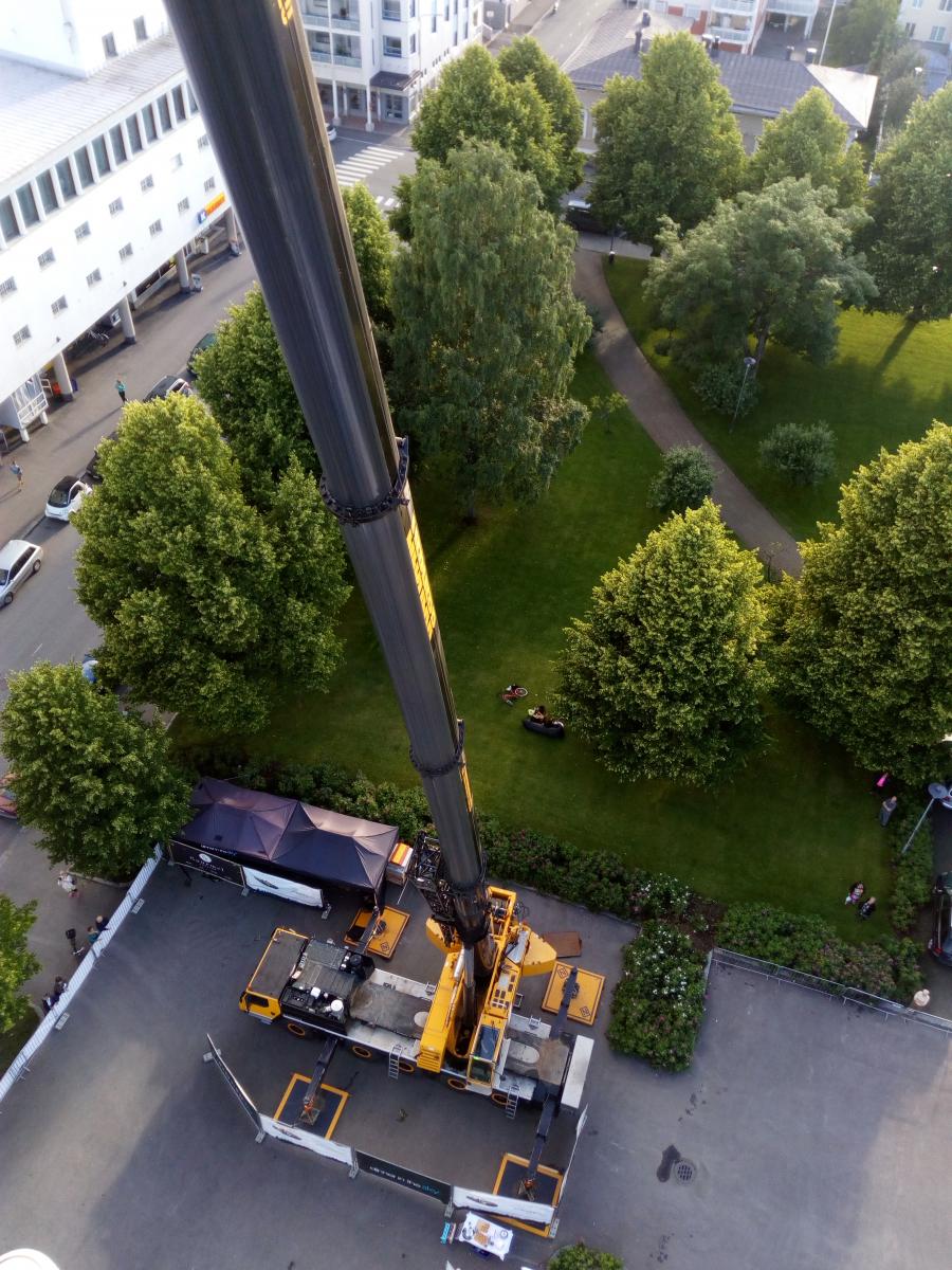 Sunsets Kuopio beach volley event took place in Kuopio Harbour 3-5.8.2017 and offered a change for a unique experience, when Dinner In The Sky Kuopio brought the worldwide popular skyrestaurant to Kuopio for the first time. Nostokonepalvelu's Liebherr LTM 1130 lifted the 22 seated restaurant at 50 meters, where diners enjoyed the beautiful view over Kuopio city and the lake Kallavesi.